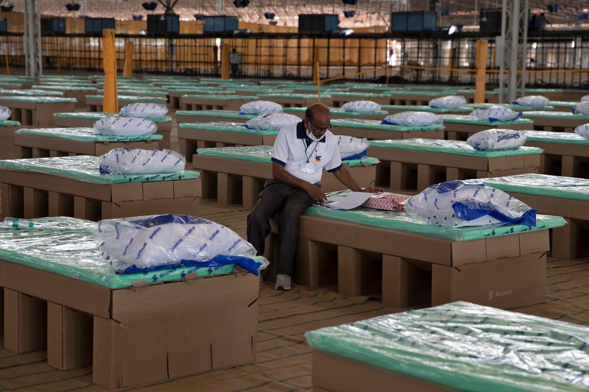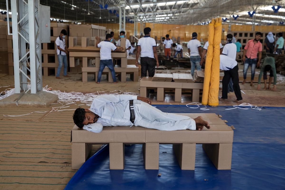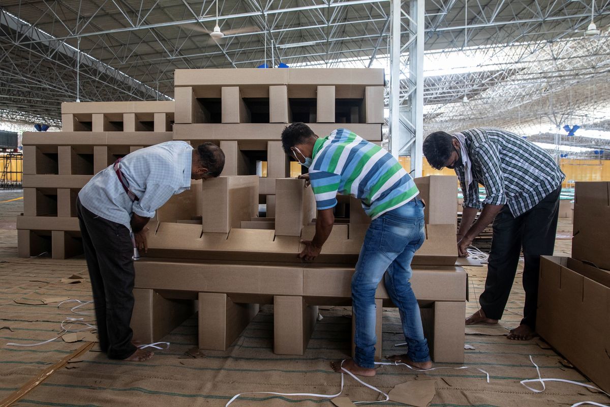 Rows of disposable beds made out of cardboard are seen at the campus of Radha Soami Satsang Beas, a spiritual organization, where a coronavirus disease (COVID-19) care centre has been constructed for the patients amidst the spread of the disease, in New Delhi, India, June 25, 2020. REUTERS/Danish Siddiqui
