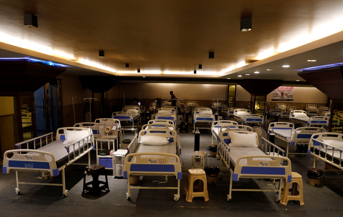 A medical worker is reflected in a mirror next to beds inside a banquet hall after it was temporarily converted into a makeshift quarantine facility for patients diagnosed with the coronavirus disease (COVID-19), in New Delhi, India, June 25, 2020. REUTERS/Anushree Fadnavis