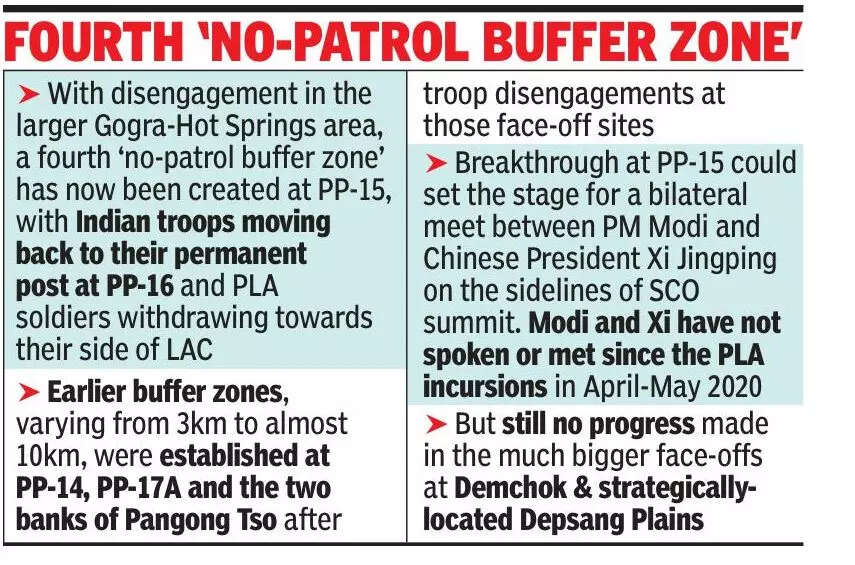 The earlier buffer zones, varying from 3-km to almost 10-km, were established at PP-14, PP-17A and the two banks of Pangong Tso after troop disengagements at those face-off sites. The disengagement in the Pangong Tso-Kailash Range region took place in February 2021 and at PP-17A near the crucial Gogra post in early-August that year. There are, however, major concerns that these buffer zones have largely come up in what India claims to be its territory, as was reported earlier by TOI.