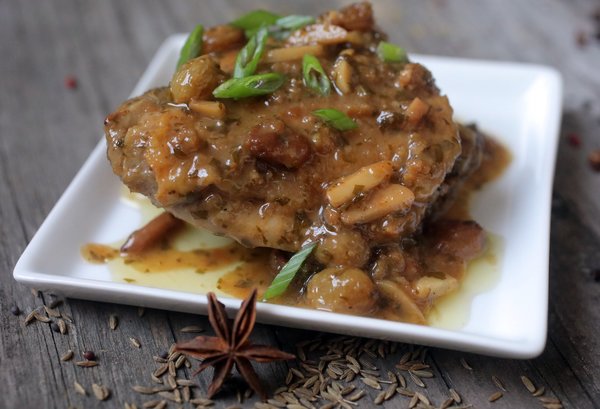 The next dish was similar in tone, but utterly different _ which is the joy of Indian cooking. As with the lamb dish, Chicken with Dried Fruit is a stew (technically, it's a braise) cooked with an abundance of spice. Actually, many of the spices are even the same.