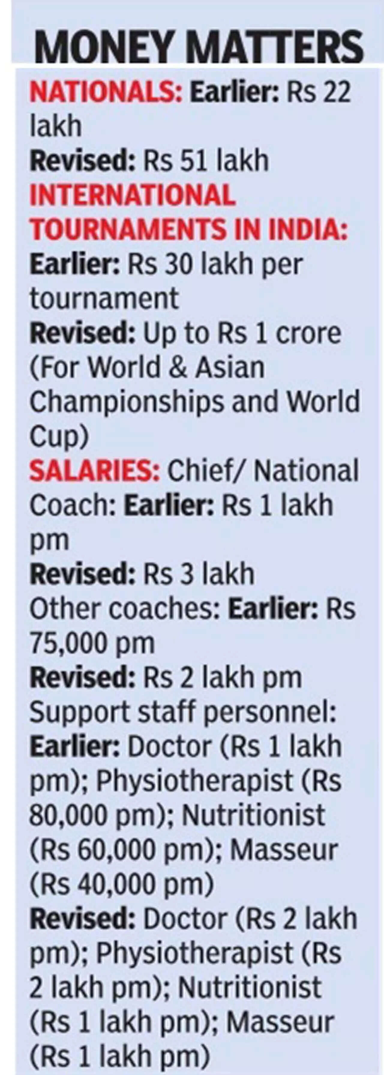 Earlier, the amount was Rs 30 lakh. For the Nationals, the revised financial grant has been at Rs 51 lakh (Rs 17 lakh each for senior, junior and sub-junior categories). Earlier, it was Rs 22 lakh (Rs 5 lakh for senior, Rs 7 lakh for junior and Rs 10 lakh for sub-junior).