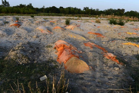 The issue was further exacerbated after rain and wind exposed a number of saffron-cloth-covered bodies buried in shallow sandpits on the riverbank.