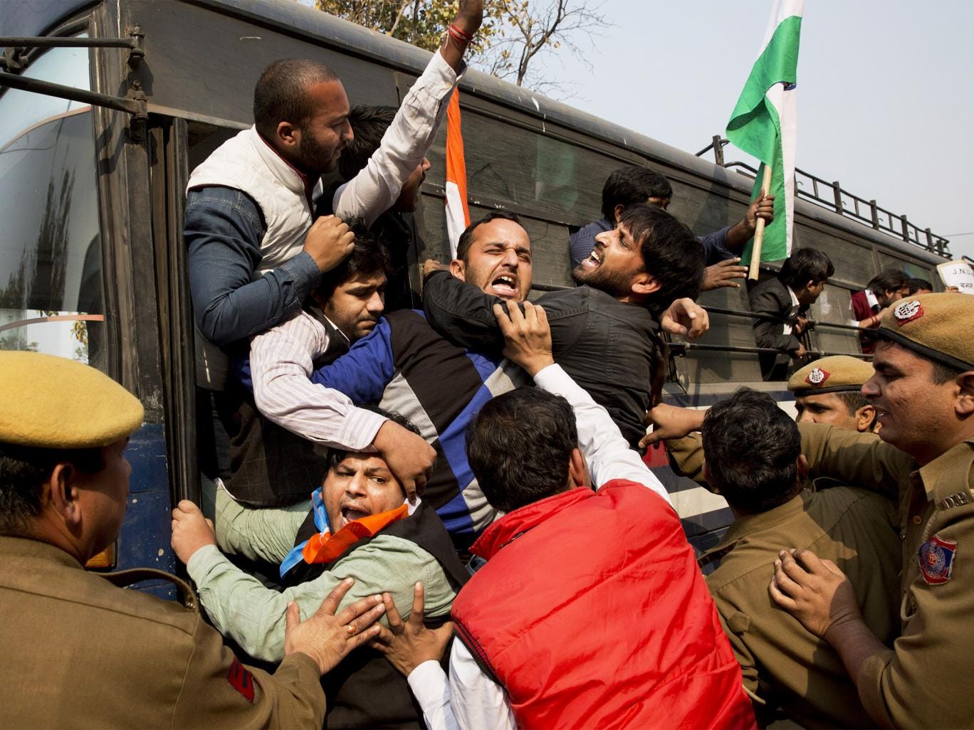 Kanhaiya Kumar, head of the student union at Delhi’s prestigiious Jawaharlal Nehru University (JNU), was rushed from a car through a gate into the court by police officers protecting him with a riot shield. He was later remanded in custody by the court until 2 March. Lawyers chanting nationalist slogans earlier barged into the compound and threw stones, defying a Supreme Court order banning protests after a punch-up at a hearing on Monday.