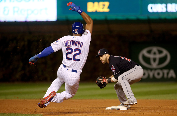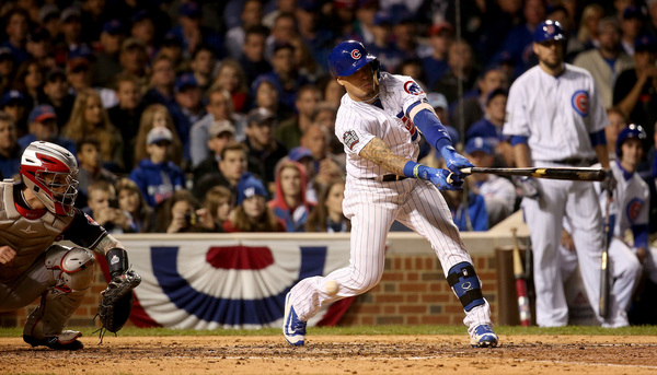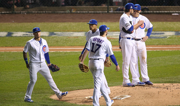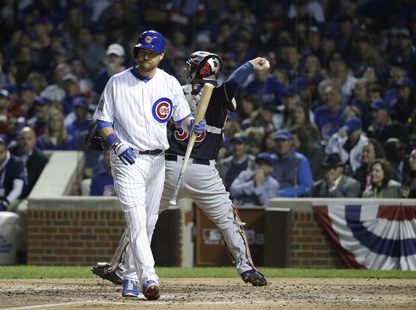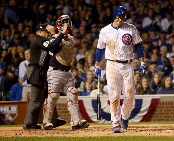 Maddon elected to stick with Lackey, rather than use a hitter to attack Kluber. Lackey struck out. Fowler grounded out. Kluber wavered for a few moments, walking Bryant and plunking Rizzo. He recovered to strike out left fielder Ben Zobrist for the third out.