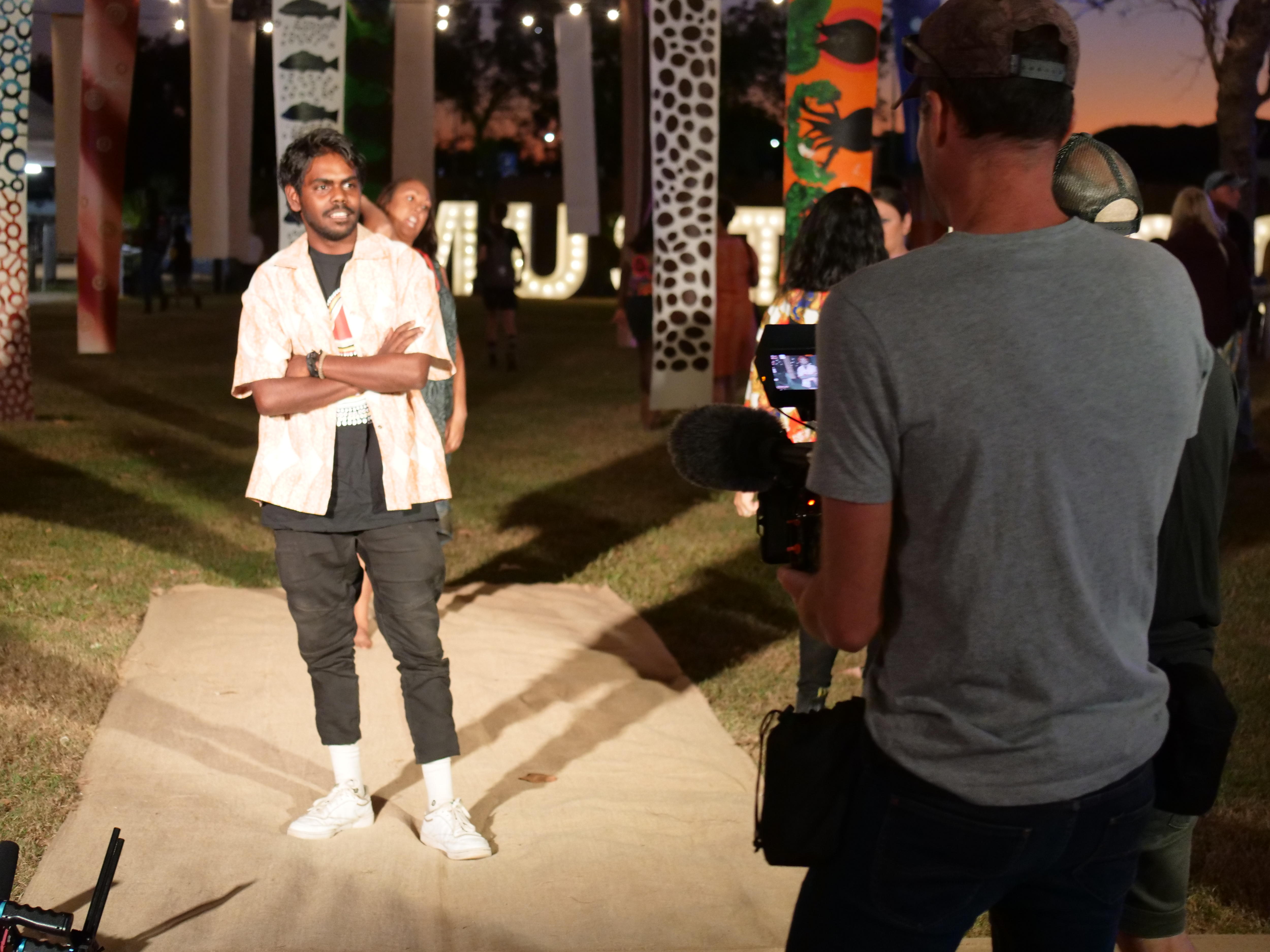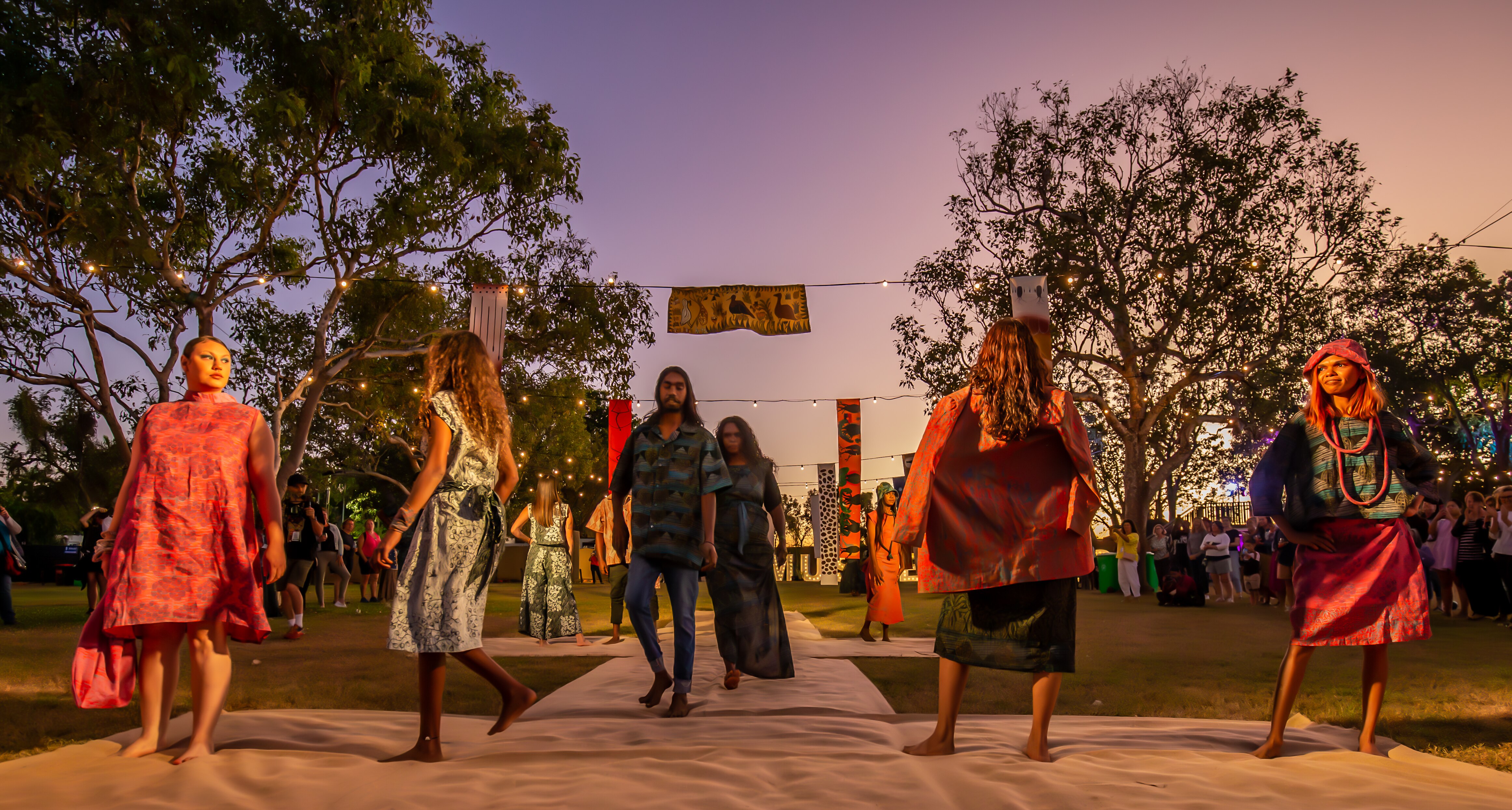 At dusk in an outback town's park, under the glow of lights wrapped around eucalyptus and boab trees, models strut along a makeshift runway.