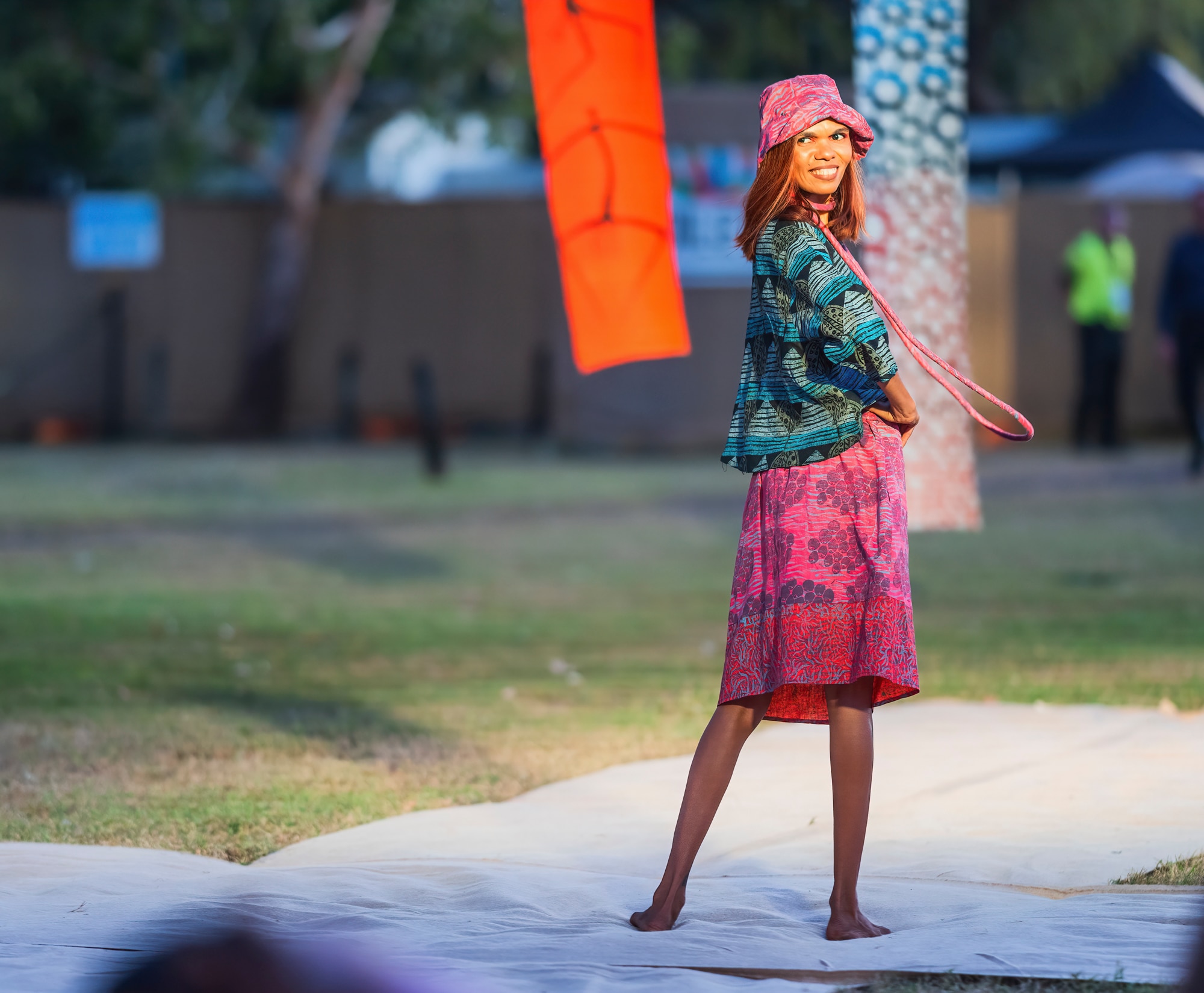 Rhiana Cherrabun's dress, top, hat and necklace combine contrasting pinks, greens and blues.