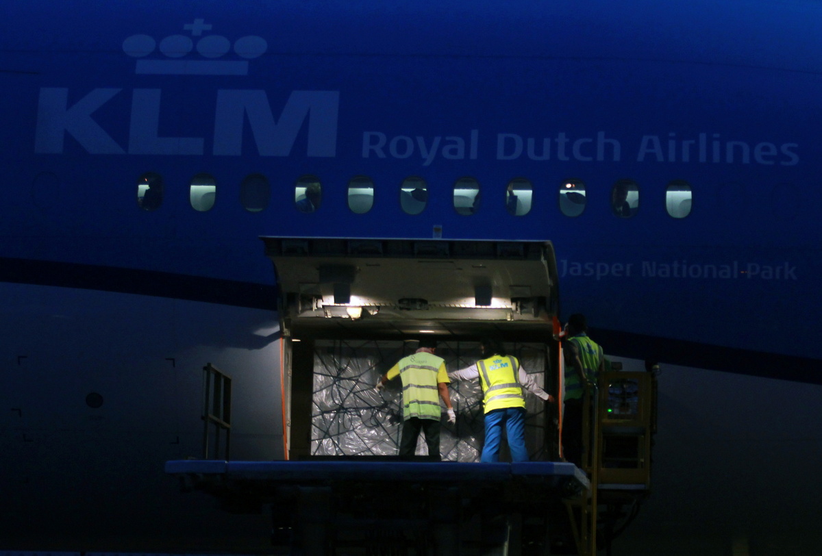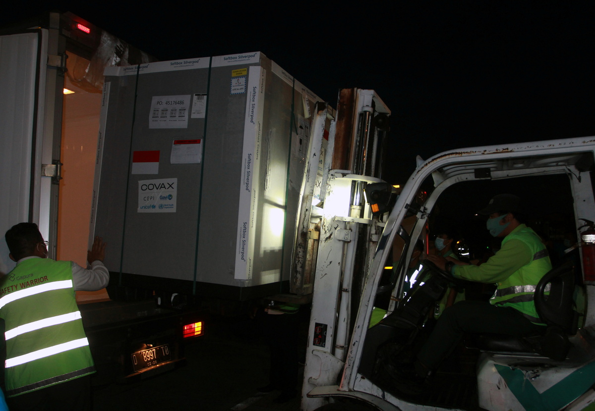 Workers unload boxes of AstraZeneca vaccine against COVID-19 that arrived at the Soekarno-Hatta International Airport in Tangerang, on the outskirts of Jakarta, Indonesia, March 8, 2021. Muhammad Iqbal/Antara Foto via REUTERS