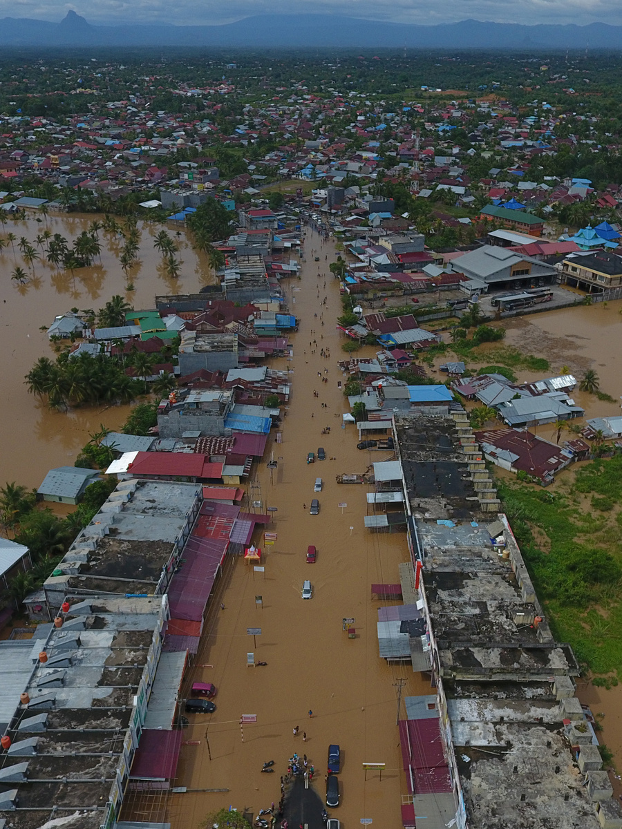 An aerial view shows a flooded area in Bengkulu, Indonesia, April 27, 2019. Picture taken April 27, 2019. Antara Foto/David Muharmansyah/ via REUTERS