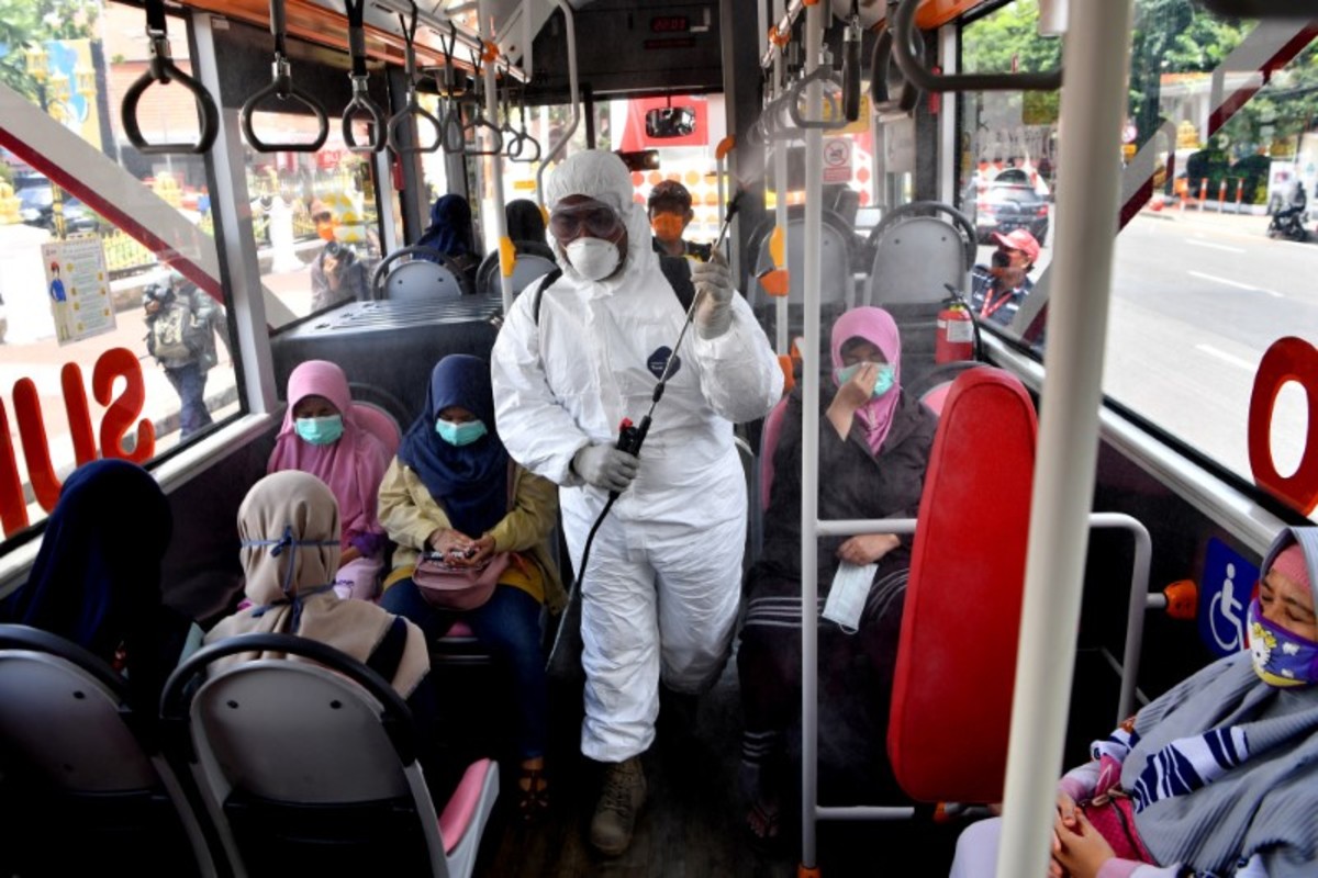 A worker sprays disinfectant in the bus, to prevent the spread of coronavirus disease (COVID-19) in Surabaya, East Java Province, Indonesia March 22, 2020. Antara Foto/Zabur Karuru via REUTERS