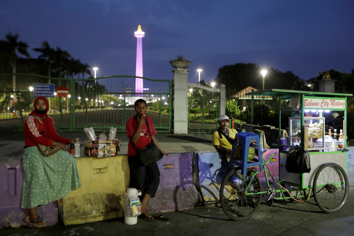 FILE PHOTO: Street vendors wait for customers outside the National Monument (Monas) complex, as the coronavirus disease (COVID-19) outbreak continues in Jakarta, Indonesia, September 11, 2020. REUTERS/Willy Kurniawan