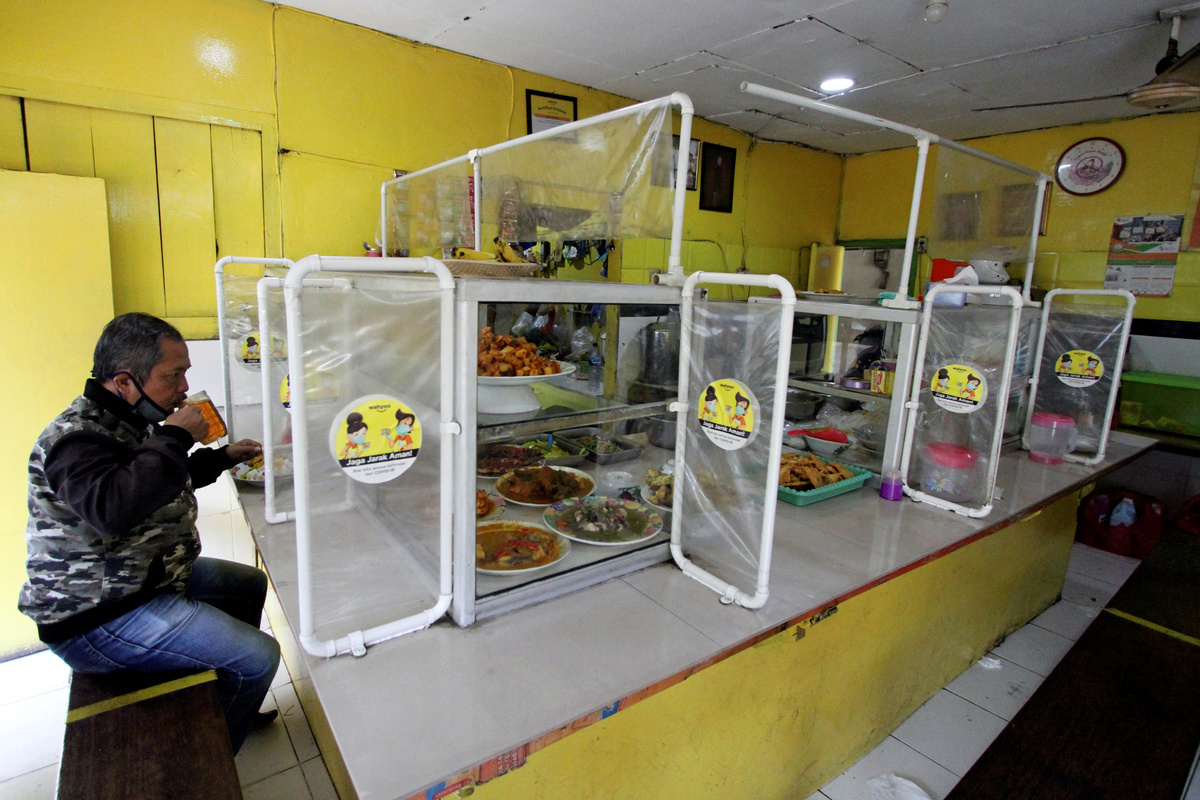 A man dines while social distancing between eating spaces are in place at a food stall as Indonesia's capital Jakarta returns to large-scale social restrictions amid the coronavirus disease (COVID-19) outbreak in Jakarta, Indonesia, September 14, 2020. REUTERS/Adi Kurniawan