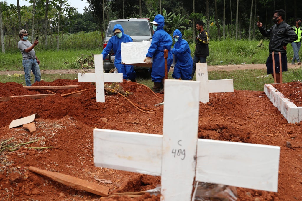 “As the diggers are too tired and do not have enough resources to dig, the residents in my neighborhood decided to help," said Jaya Abidin, who lives in Bogor on the outskirts of the capital. “Because if we do not do this, we will have to wait in turn a long time for a burial in the middle of the night.”