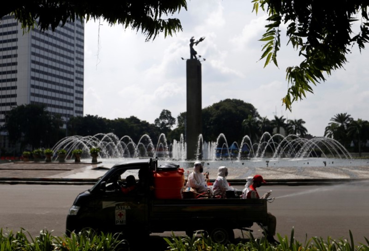 Red Cross staff wearing protective suits spray disinfectant to prevent the spread of the coronavirus disease (COVID-19), in Jakarta, Indonesia, May 31, 2020. REUTERS/Ajeng Dinar UlfianaA Red Cross staff member wearing a protective suit sprays disinfectant to prevent the spread of the coronavirus disease (COVID-19) in Jakarta, Indonesia, May 31, 2020. REUTERS/Ajeng Dinar Ulfiana