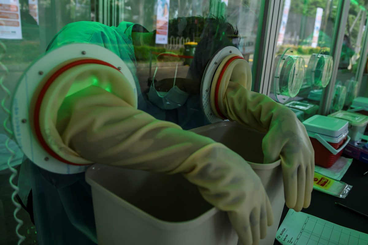 A medical staff member waits to take a swab sample from a citizen amid the coronavirus disease (COVID-19) outbreak, in Jakarta, Indonesia May 20, 2020, in this photo taken by Antara Foto. Antara Foto/Muhammad Adimaja/ via REUTERS