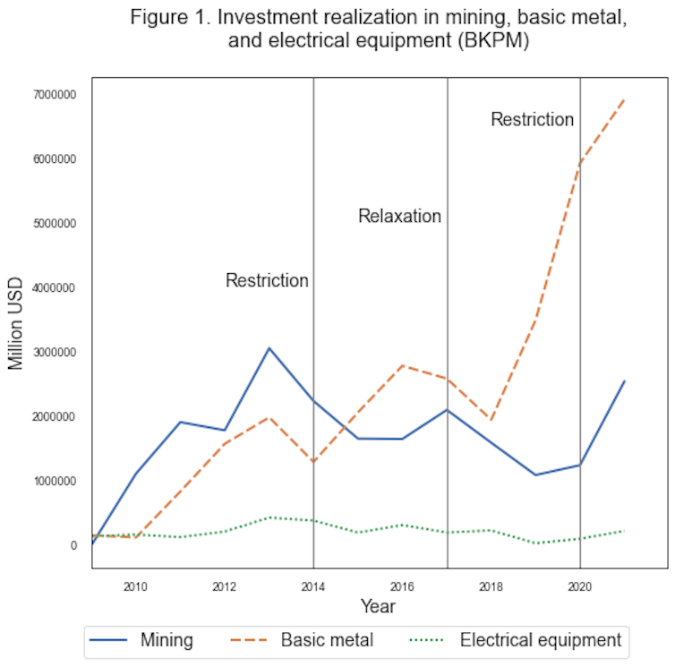 The data show that investments in the mining industry dropped in 2014 when the government introduced a ban on nickel ore exports, taking away one of the main incentives for investment. However, in 2021, data show that investments in the industry increased from the previous year, indicating that an export ban does not hurt investment as supplies are absorbed by the domestic market.