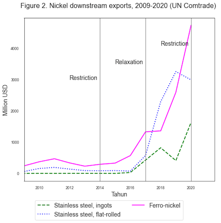 As investments in the basic metal industry increased, the production of value-added nickel products also rose. Figure 2 shows nickel-based productions ups and down were influenced by the ban in 2014, relaxation in 2017 and reimplementation of the ban in 2020.