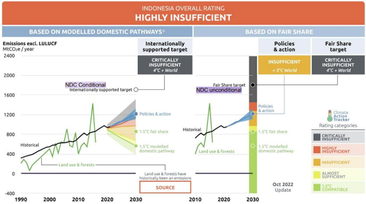 Global research coalition Climate Action Tracker (CAT) categorises Indonesia’s climate goals as “Critically Insufficient”, which means they are far from enough to curb global warming.