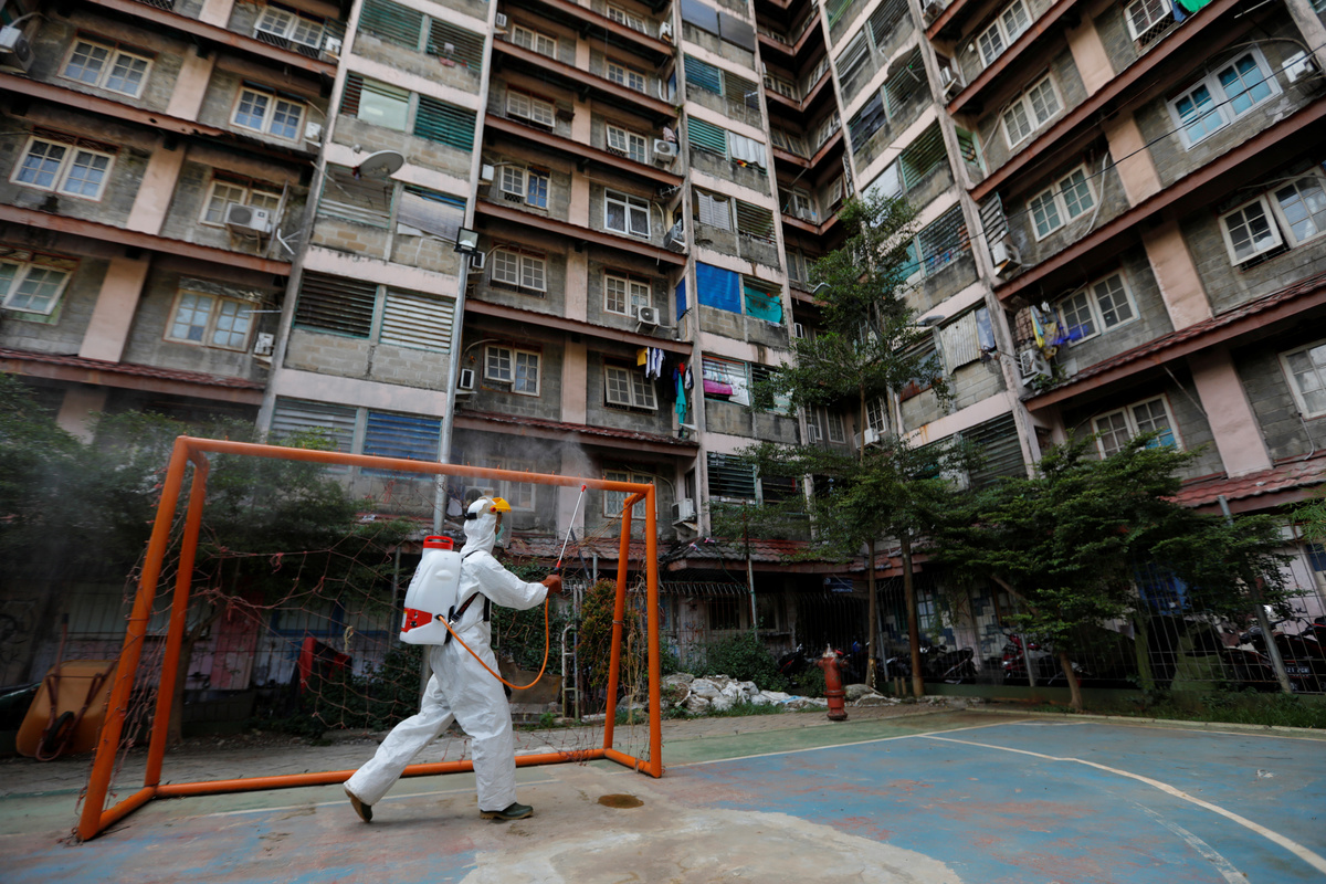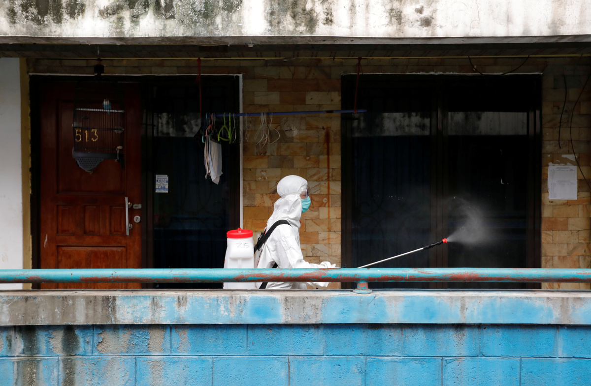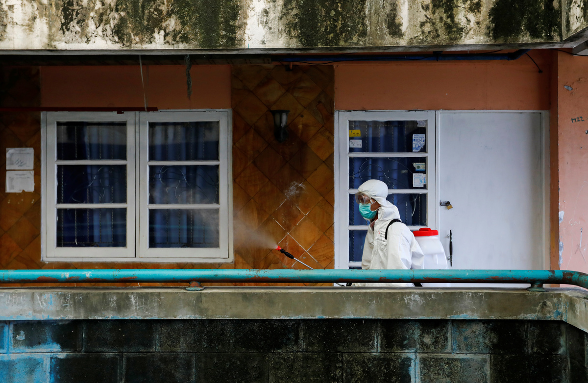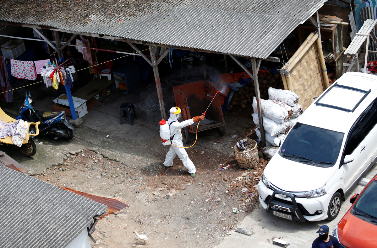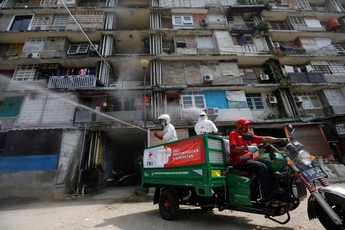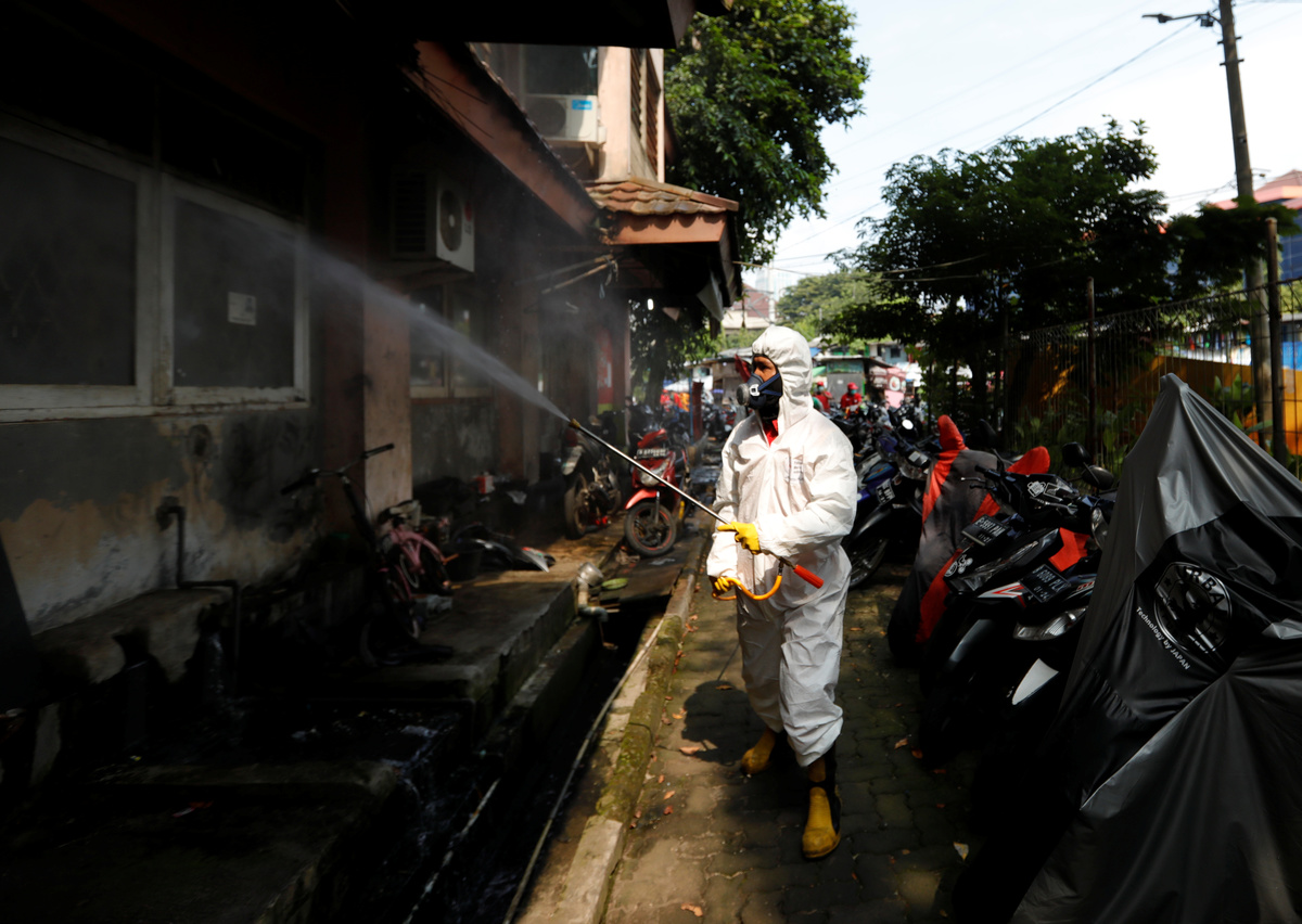 Red Cross personnel wearing protective suits spray disinfectant near a beauty salon in a densely populated neighbourhood area, amid the spread of the coronavirus disease (COVID-19) in Jakarta, Indonesia, April 4, 2020. REUTERS/Willy KurniawanRed Cross personnel wearing protective suits spray disinfectant in a densely populated neighbourhood area, amid the spread of the coronavirus disease (COVID-19) in Jakarta, Indonesia, April 4, 2020. REUTERS/Willy KurniawanA Red Cross personnel wearing a protective suit sprays disinfectant along a street in a densely populated neighbourhood area, amid the spread of the coronavirus disease (COVID-19) in Jakarta, Indonesia, April 4, 2020. REUTERS/Willy KurniawanA Red Cross personnel wearing a protective suit sprays disinfectant along a corridor in a densely populated neighbourhood area, amid the spread of the coronavirus disease (COVID-19) in Jakarta, Indonesia, April 4, 2020. REUTERS/Willy KurniawanA Red Cross personnel wearing a protective suit sprays disinfectant along a corridor in a densely populated neighbourhood area, amid the spread of the coronavirus disease (COVID-19) in Jakarta, Indonesia, April 4, 2020. REUTERS/Willy KurniawanA Red Cross personnel wearing a protective suit sprays disinfectant along a corridor in a densely populated neighbourhood area, amid the spread of the coronavirus disease (COVID-19) in Jakarta, Indonesia, April 4, 2020. REUTERS/Willy Kurniawan