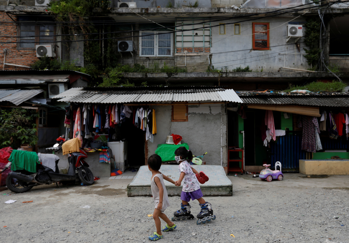 Children wearing face masks play along a street in a densely populated neighbourhood area, amid the spread of the coronavirus disease (COVID-19), in Jakarta, Indonesia, April 4, 2020. REUTERS/Willy Kurniawan
