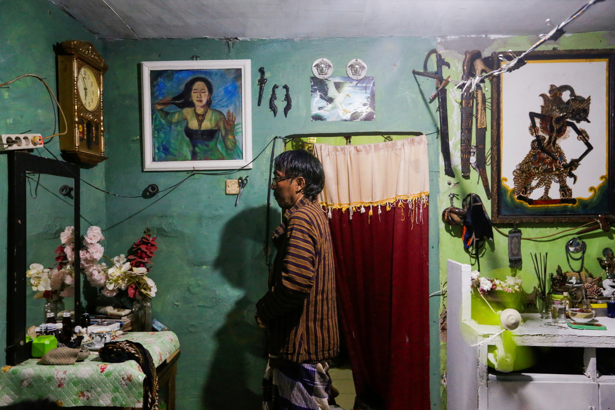 Seated cross-legged amid a fog of incense and platters of fragrant offerings, dishes of red chillies, garlic bulbs and frangipani petals, Indonesian shaman Ki Joko Sapu-Jagat prepares at home the night before his first day back on the job.