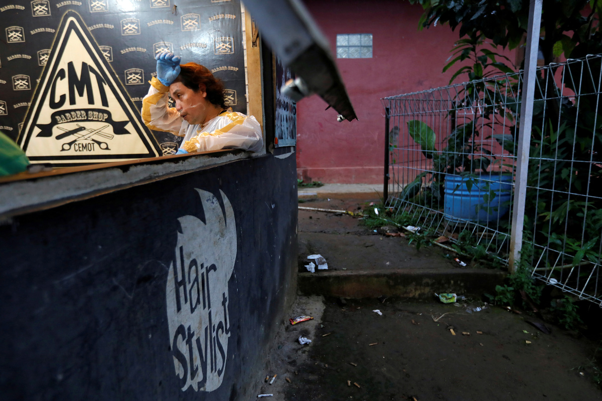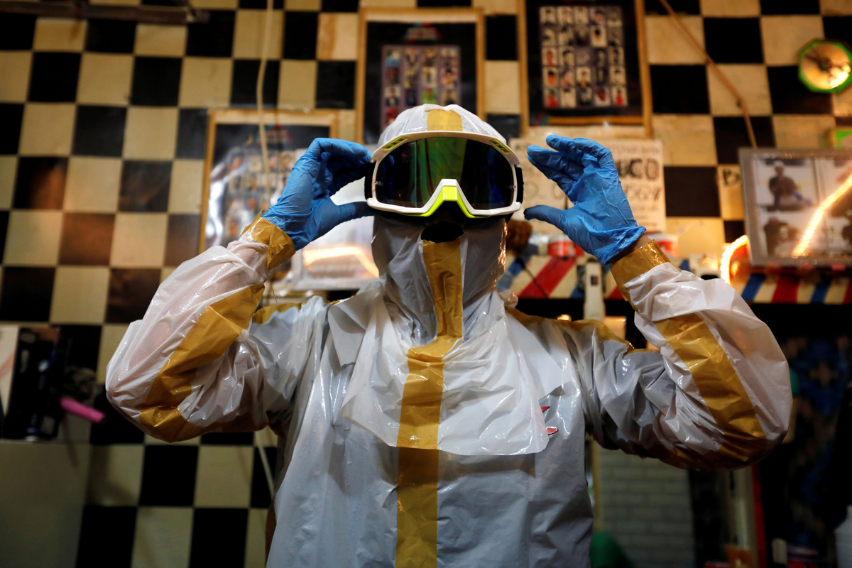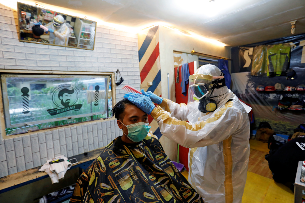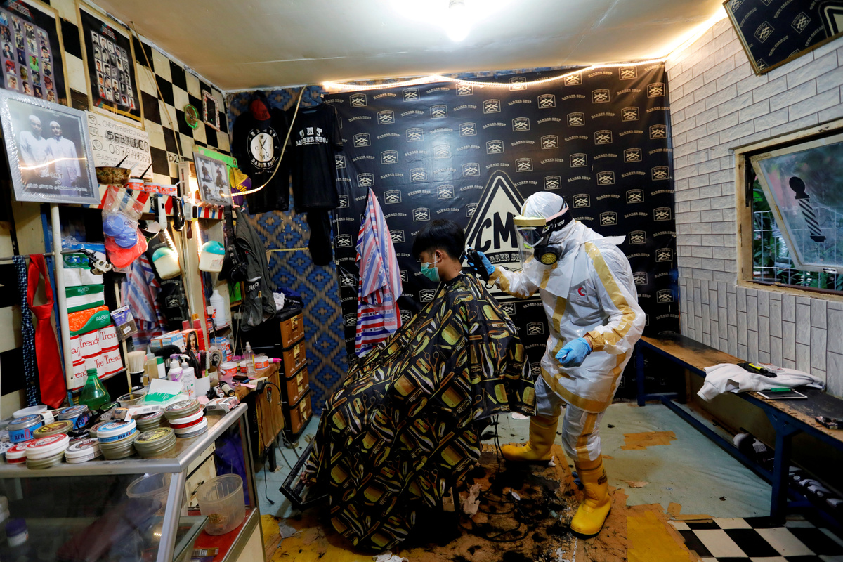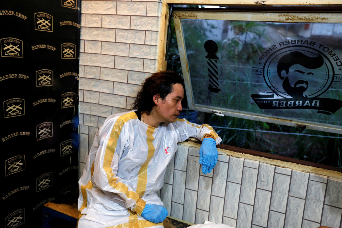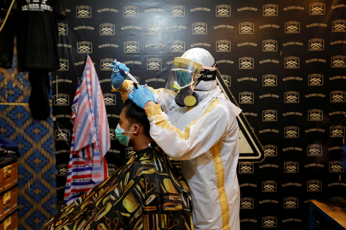 Herman Maulanasyah, a 40-year-old hair stylist, gives a haircut to a customer at his barbershop, while wearing a handmade protective suit in a tribute to the country's medical workers tackling the coronavirus disease (COVID-19) and to campaign for awareness about the rising number of deaths, in Bogor, Indonesia, April 6, 2020. REUTERS/Willy KurniawanHerman Maulanasyah, a 40-year-old hair stylist, gives a haircut to a customer at his barbershop, while wearing a handmade protective suit in a tribute to the country's medical workers tackling the coronavirus disease (COVID-19) and to campaign for awareness about the rising number of deaths, in Bogor, Indonesia, April 6, 2020. REUTERS/Willy KurniawanHerman Maulanasyah, a 40-year-old hair stylist, gives a haircut to a customer at his barbershop, while wearing a handmade protective suit in a tribute to the country's medical workers tackling the coronavirus disease (COVID-19) and to campaign for awareness about the rising number of deaths, in Bogor, Indonesia, April 6, 2020.Herman Maulanasyah, a 40-year-old hair stylist, gives a haircut to a customer at his barbershop, while wearing a handmade protective suit in a tribute to the country's medical workers tackling the coronavirus disease (COVID-19) and to campaign for awareness about the rising number of deaths, in Bogor, Indonesia, April 6, 2020.