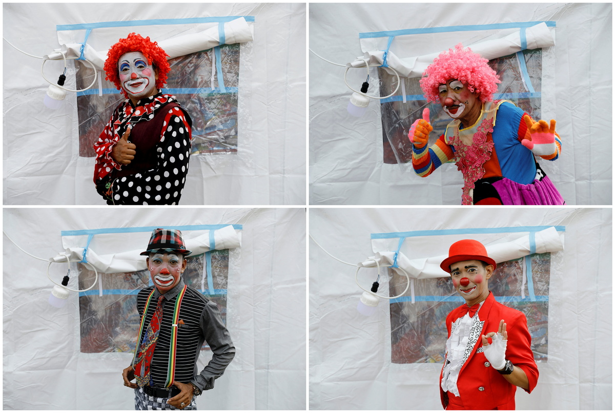 A combination photo shows members of clowns' association named Aku Badut Indonesia or 'I Indonesia Clown': Eko Wardoyo, 48, Didik Giri Santoso, 52, Jari Santoso, 52, Sumantri, 42, pose for a picture outside a temporary tent after performing a show to bring cheers to children who were affected by the eruption of Mount Semeru volcano, at a temporary shelter in Penanggal, Candipuro district, Lumajang, East Java province, Indonesia, December 9, 2021. REUTERS/Willy Kurniawan