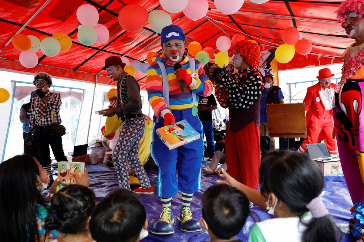 Dedy Rachmanto, 53, known as Dedy Delon who is the founder of a clowns' association named Aku Badut Indonesia or 'I Indonesia Clown', gives the books to children as a gift while performing a show to cheer them who were affected by the eruption of Mount Semeru volcano, inside a temporary tent in Penanggal, Candipuro district, Lumajang, East Java province, Indonesia, December 9, 2021. REUTERS/Willy Kurniawan