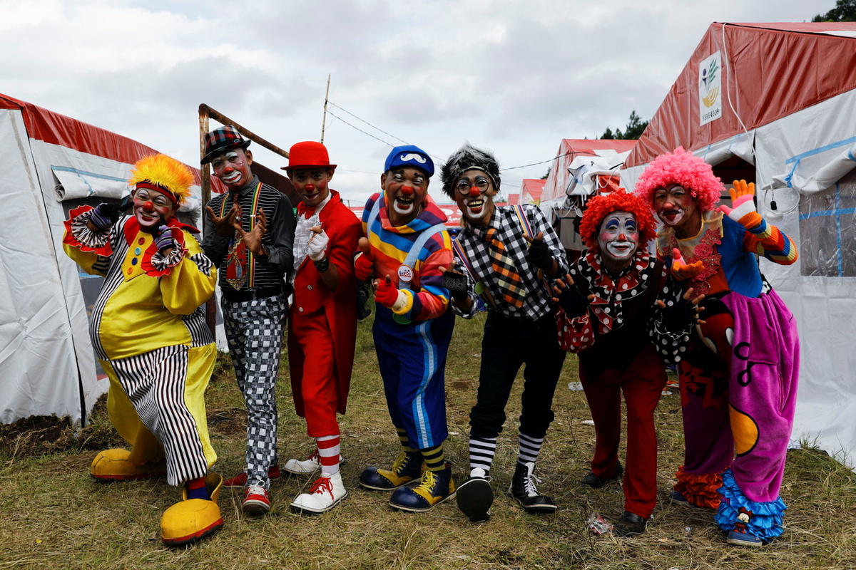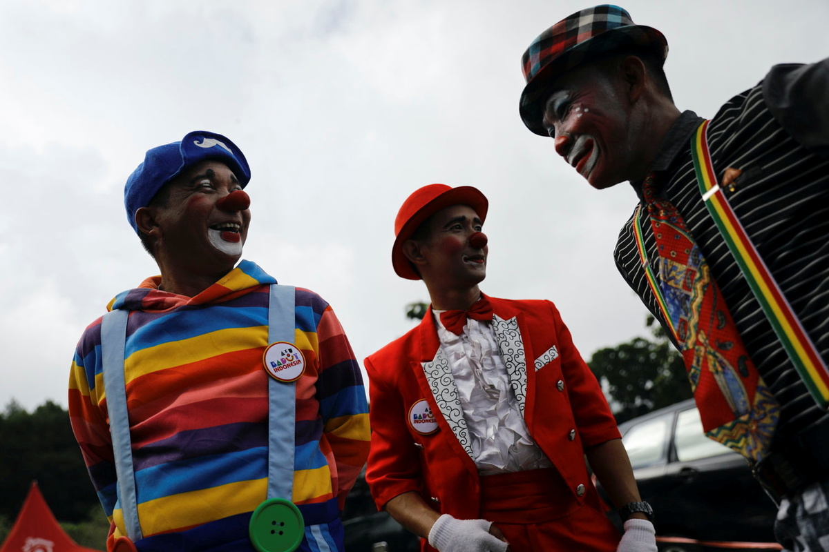 Clowns brought a few moments of cheer to displaced children in Indonesia on Thursday, putting on a special show after a volcanic eruption killed 43 people and forced thousands to flee villages that were later blanketed in ash
