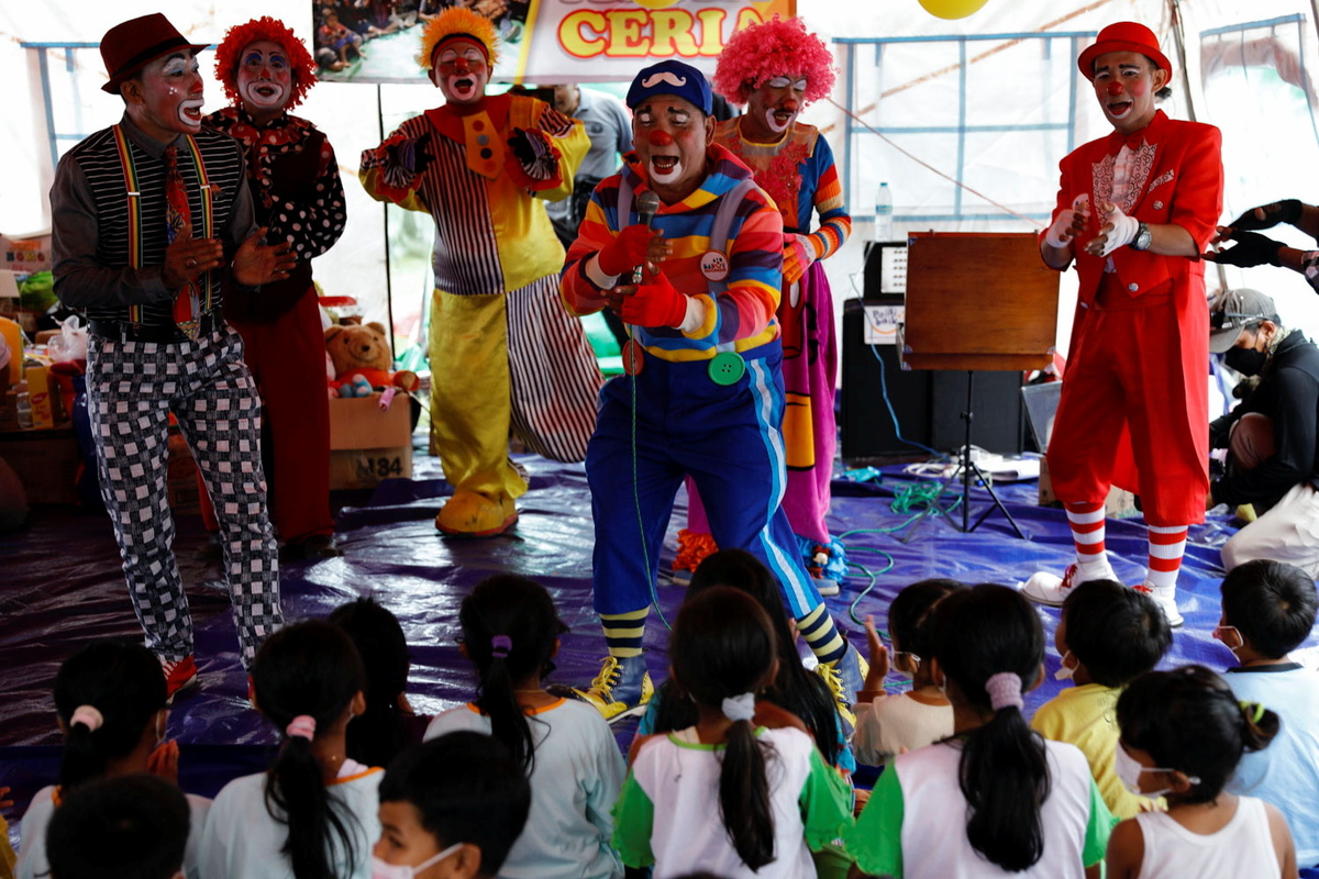 Evacuees clapped and laughed as red-nosed clowns dressed in neon wigs and multi-coloured costumes volunteered for a show of games and magic tricks in a tent in an evacuation camp in Lamajang on Indonesia's Java island.