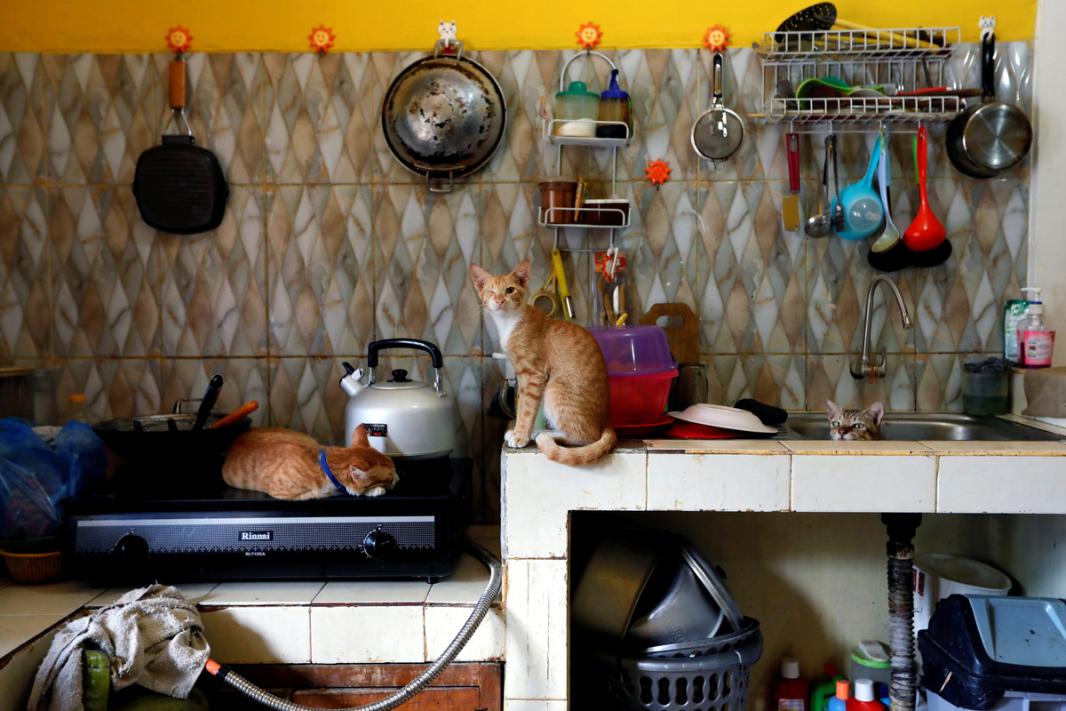 Cats are pictured in the kitchen of a cat shelter called "Rumah Kucing Parung" in Bogor, West Java province, Indonesia December 23, 2019. REUTERS/Willy Kurniawan