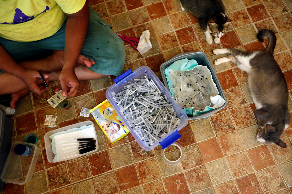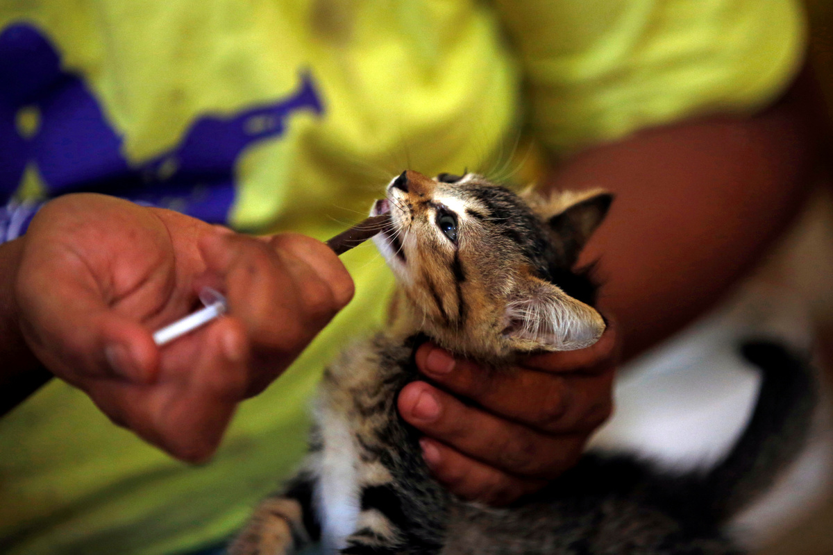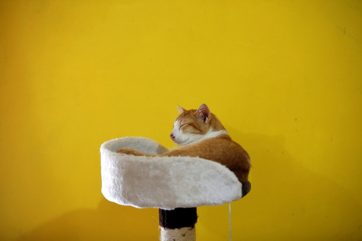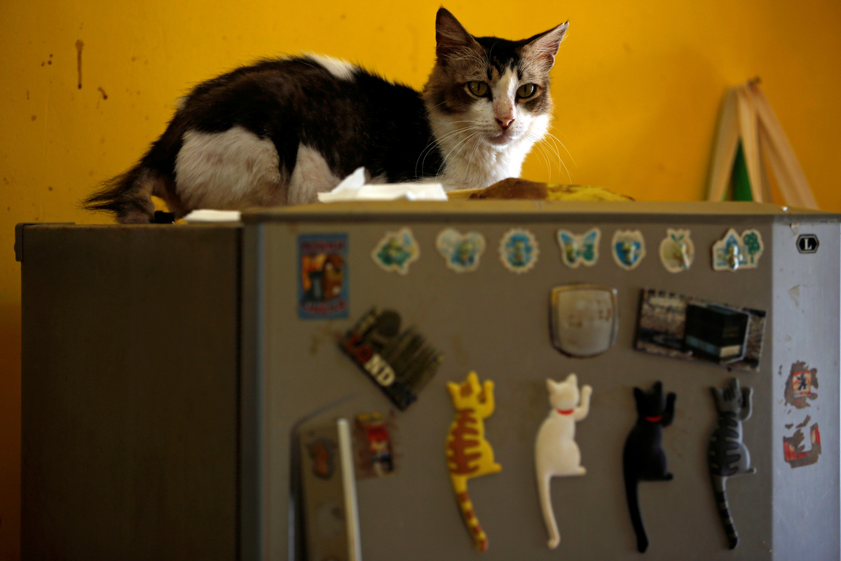 A cat sits on a refrigerator at a cat shelter called "Rumah Kucing Parung" in Bogor, West Java province, Indonesia December 23, 2019. REUTERS/Willy KurniawanA medical technician and groomer gives cat a vitamin treatment at a cat shelter called "Rumah Kucing Parung" in Bogor, West Java province, Indonesia December 23, 2019. REUTERS/Willy KurniawanA groomer and medical technician of a cat shelter called "Rumah Kucing Parung" prepares vitamin and medicines for the cats in Bogor, West Java province, Indonesia December 23, 2019. REUTERS/Willy KurniawanA cat lays on a cat scratcher at a cat shelter called "Rumah Kucing Parung" in Bogor, West Java province, Indonesia December 23, 2019. REUTERS/Willy KurniawanA cat reacts as it is being fed during lunch time at a cat shelter called "Rumah Kucing Parung" in Bogor, West Java province, Indonesia December 23, 2019. REUTERS/Willy Kurniawan