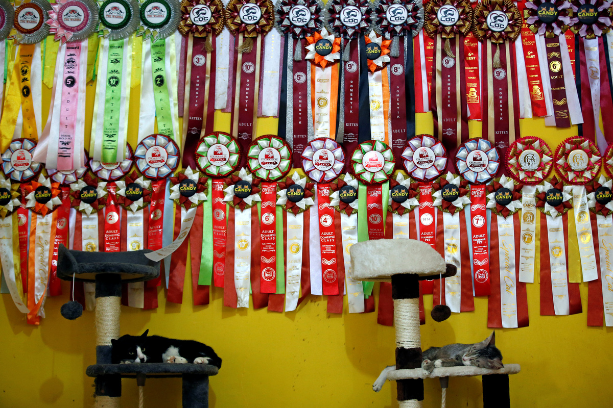 Cats lay on cat scratchers below medals which they won in cat contests, at a cat shelter called "Rumah Kucing Parung" in Bogor, West Java province, Indonesia December 23, 2019. REUTERS/Willy Kurniawan