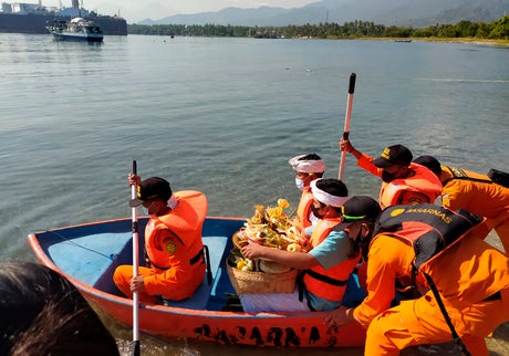 The ceremony included relatives casting flowers into the ocean from the navy’s hospital ship.