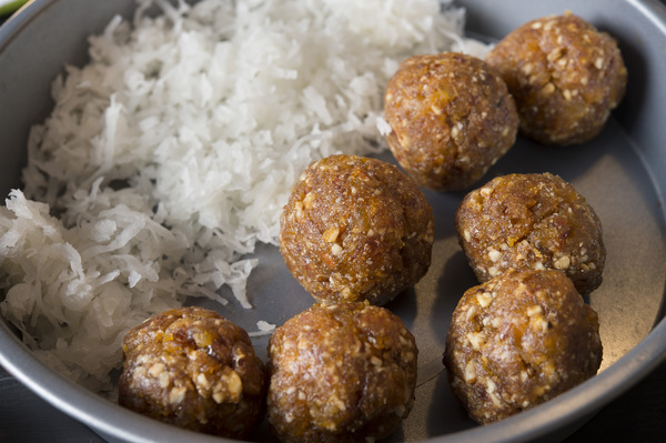 Plus, the bites are no-bake: Dates and dried apricots are pulsed with toasted nuts and a bit of honey in a food processor and rolled in more nuts or coconut.