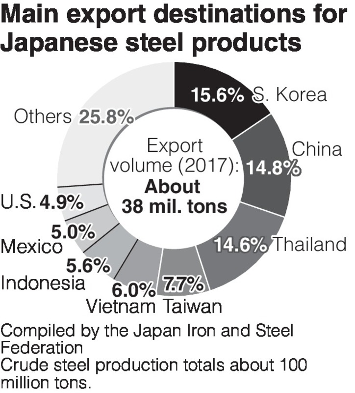 According to the federation, Japan's steel industry exports about 40 percent of its crude steel output. Japan exported about 1.9 million tons of steel products to the United States in 2017, which accounts for about 2 percent of the nation's entire crude steel output.