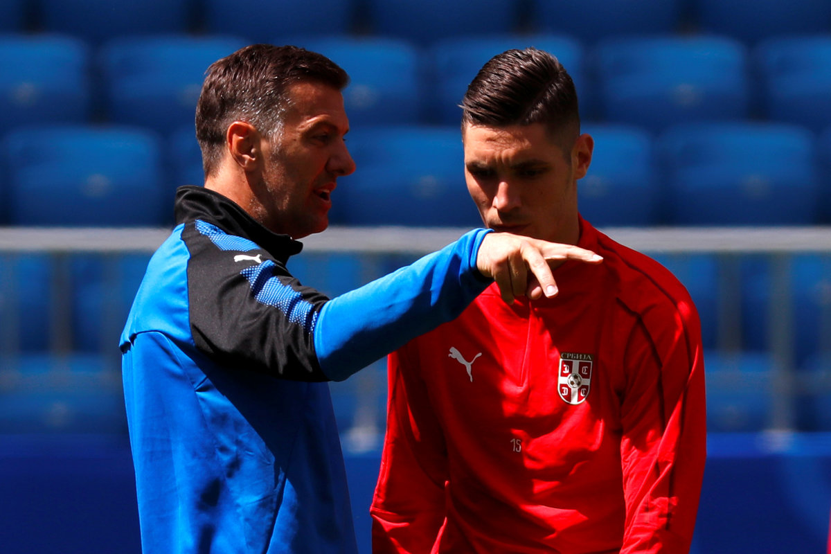 Soccer Football - World Cup - Serbia Press Conference - Samara Arena, Samara, Russia - June 16, 2018 Serbia coach Mladen Krstajic and Aleksandar Kolarov during the press conference REUTERS/David Gray