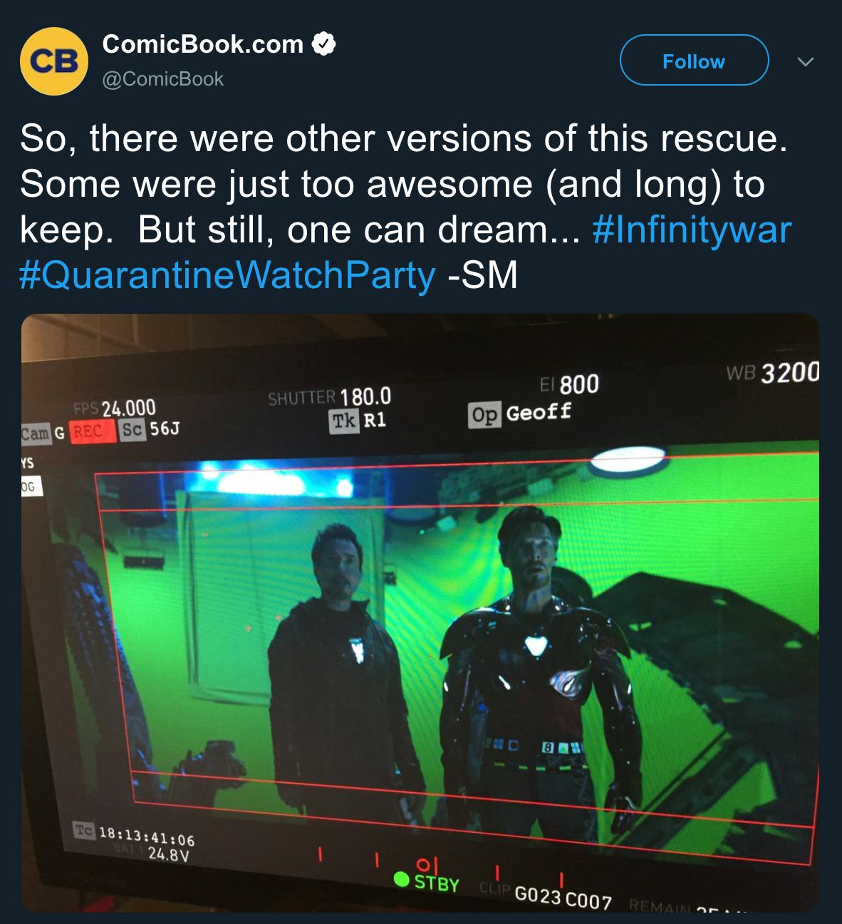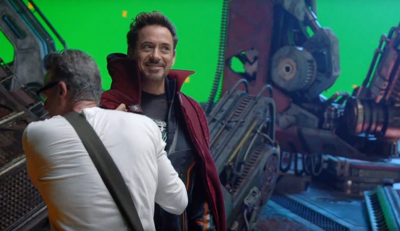 Doctor Strange in an Iron Man suit is not completely new: concept art was released in the book Endgame: the Art of the Movie showing the two characters sporting each other's signature looks, with Tony donning the Cloak of Levitation. However, it wasn't known until McFeely shared this set picture that the concept made it all the way to filming. The Russo brothers replied to the picture by saying "the best [version of the rescue] made the movie...I think."