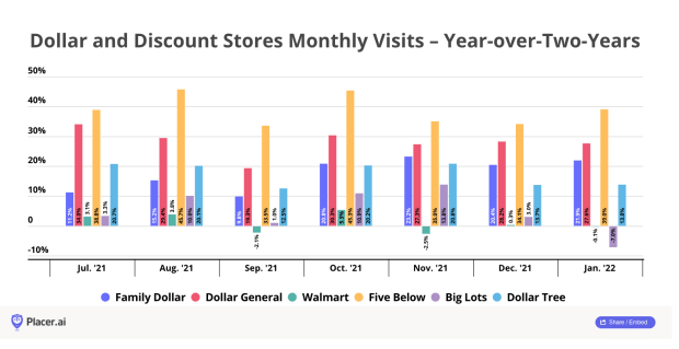 Compared to December 2019, foot traffic last December rose by 20.4% for Family Dollar (20.4%), 28.2% for Dollar General, 34.1% for Five Below, 3% for Big Lots and 13.7% for Dollar Tree.