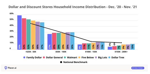 While 45% of the the general population earned under $50,000 a year between December 2020 and November 2021, a respective 59%, 54%, 52%, 50%, 48%, and 47% of customers at Family Dollar, Dollar General, Walmart, Five Below, Big Lots and Dollar Tree did so.