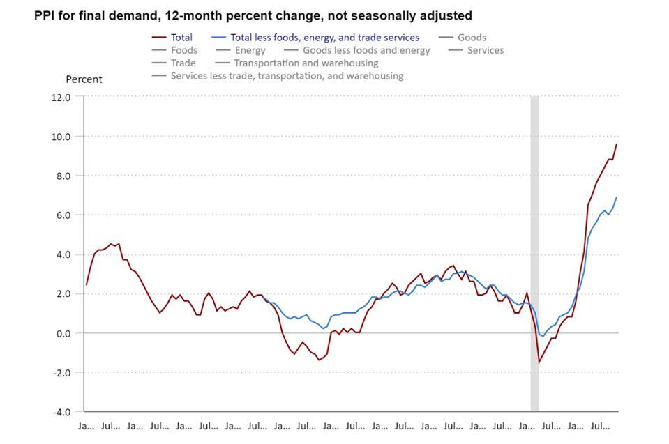 On December 14, 2021, the Bureau of Labor Statistics (BLS), released data about a significant increase in the Producer Price Index (PPI), the largest increase since the data was first calculated in November of 2010. For the 12 months ending November 2021, the PPI was up 9.6%. PPI is important because it measures the average change in prices received by producers for many products and some services. As the chart below illustrates, there is no question we have some form of inflation. The question is. How do we play defense?