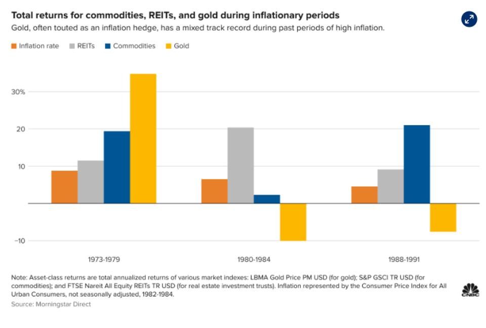 Real Estate: They Aren’t Making Any More of It. In each of the three higher inflation periods in the last 50 years, only Real Estate Investment Trusts (REITS) have provided a return greater than inflation. Real estate rents and real estate values tend to rise in inflationary times, which gives a REIT a steady cash flow stream. REITs can be invested in though the REIT itself, or through a fund or ETF. REITs have special tax treatment as well, which can change the after-tax return in taxable accounts.