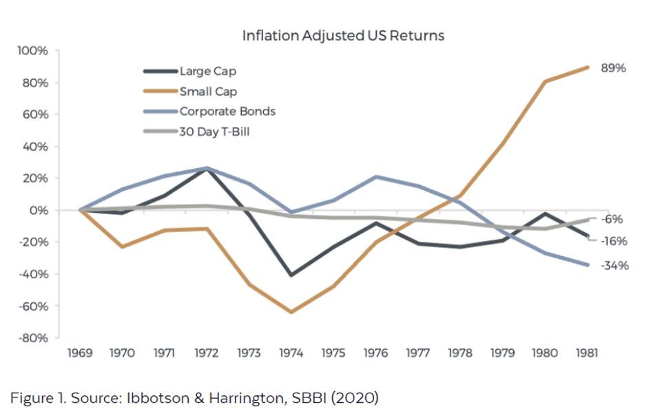 Small Cap Stocks. The theory here is simple: small companies are more nimble and can pass on price increases to customers more easily. History seems to bear this out when we compare inflation-adjusted returns from 1969: