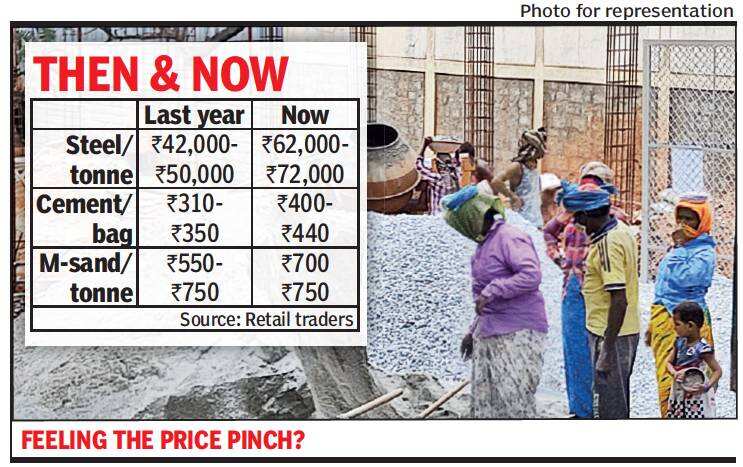 While the price of a tonne of steel has gone up from Rs 45,000 to almost Rs 70,000, a bag of cement is costing Rs 80 to Rs 100 more. Price of M-sand has also seen a rise of Rs 100 to Rs 150 per tonne.