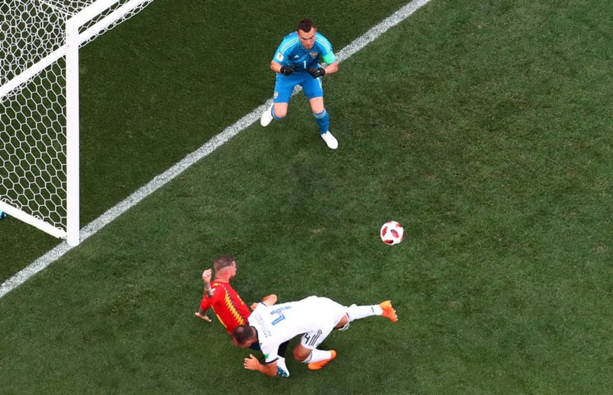 Spain, who have never beaten a host at World Cups or Euros, went ahead after 12 minutes when Sergei Ignashevich bundled into Ramos at the far post, knocking a free kick in with his heel for the 10th own goal of the tournament.