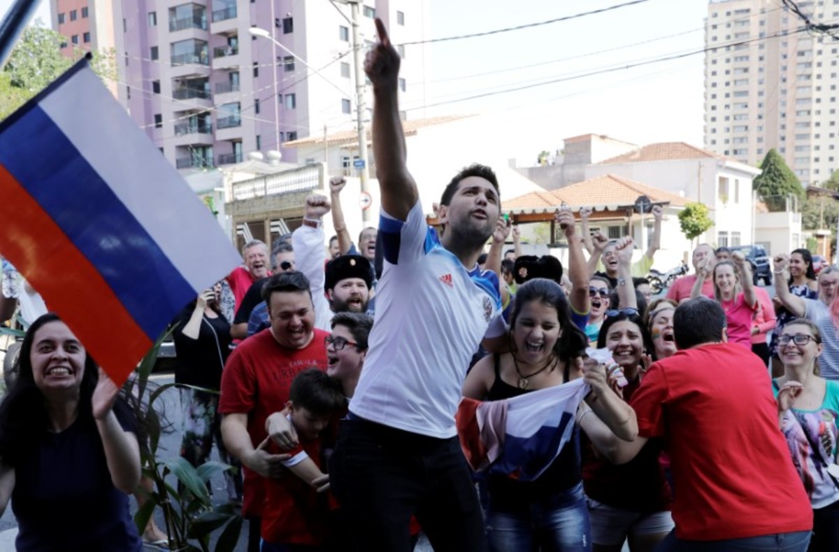 Soccer Football - World Cup - Round of 16 - Spain vs Russia - Sao Paulo, Brazil - July 1, 2018 - Fans react at the end of the match during the broadcast of FIFA World Cup outside a Russian restaurant. REUTERS/Paulo Whitaker