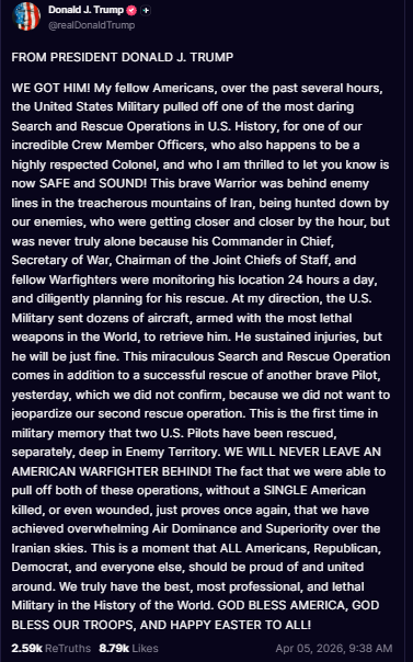 Announcing the operation, Trump said, “We got him! My fellow Americans, over the past several hours, the United States Military pulled off one of the most daring Search and Rescue Operations in US History, for one of our incredible Crew Member Officers, who also happens to be a highly respected Colonel, and who I am thrilled to let you know is now SAFE and SOUND!”