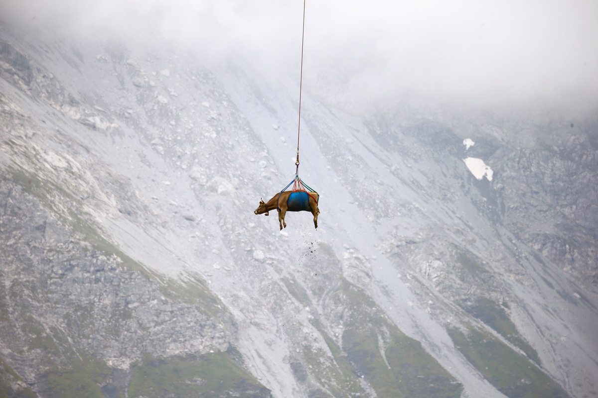 Cows injured during their summer sojourn in the high Swiss Alpine meadows got a jump on their healthier herdmates on Friday when they got helicopter rides down the mountain.