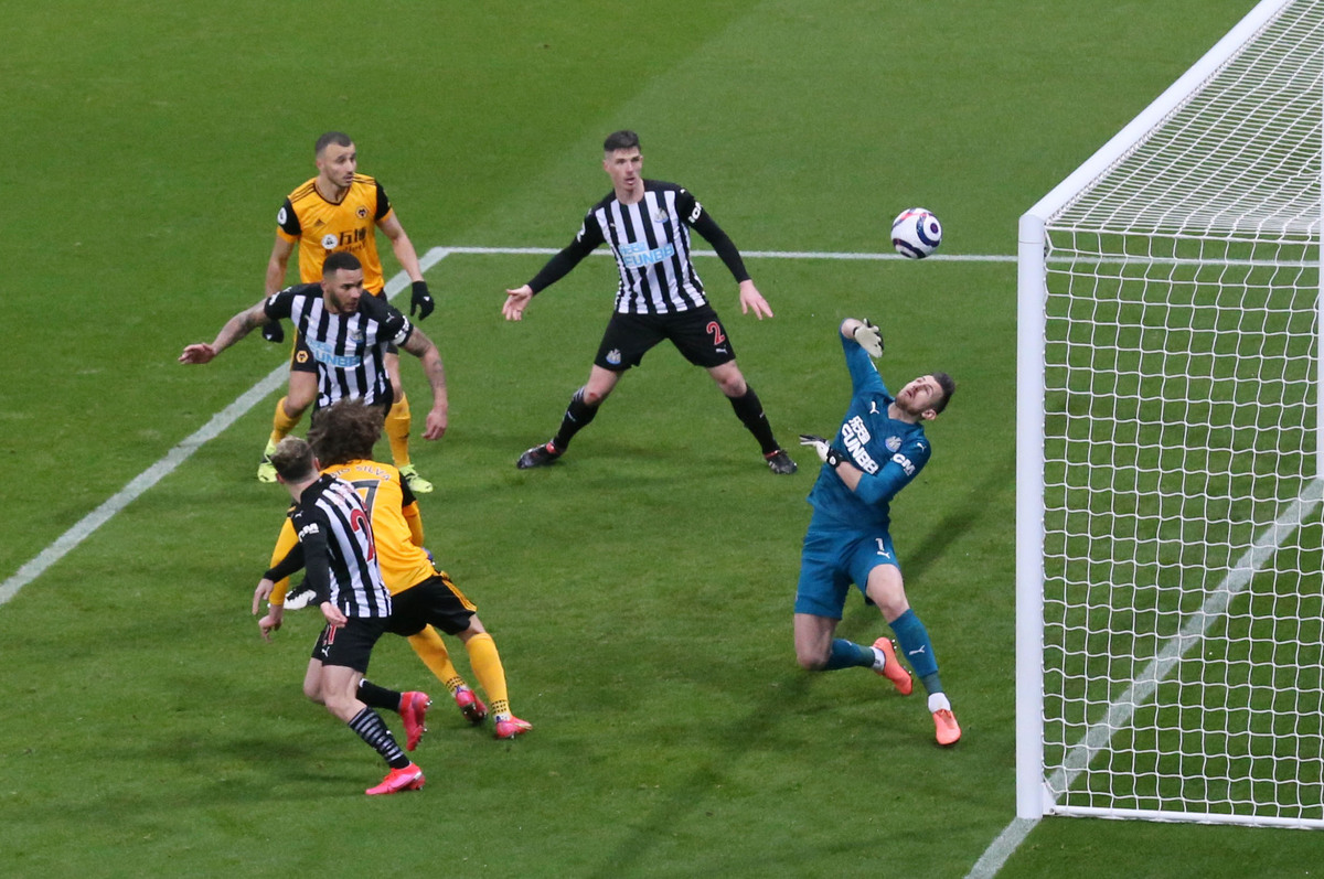 A rare late foray resulted in a superb chance for Newcastle's Brazilian striker Joelinton and his thunderous shot beat goalkeeper Rui Patricio, only to hit defender Romain Saiss just in front of the goal-line and spin away for a corner.