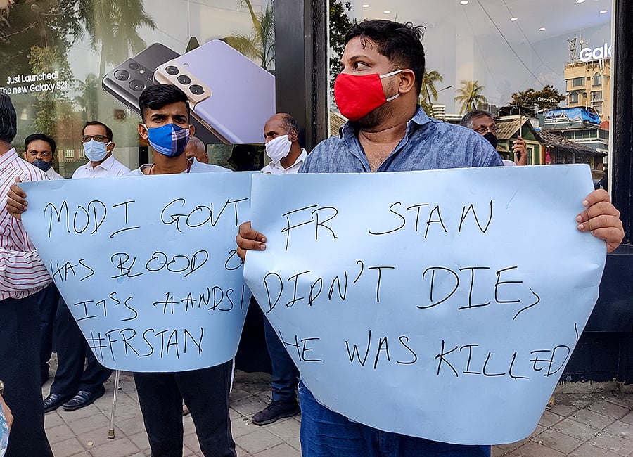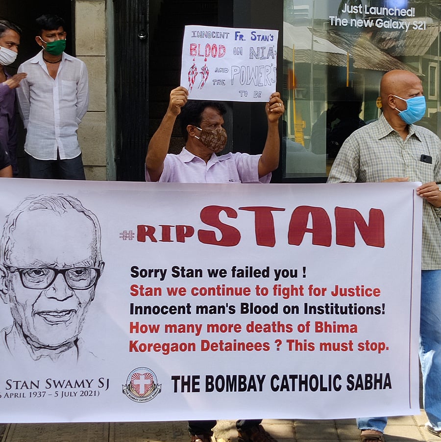 A few local politicians were also part of the group. Ruben Mascarenhas, the working president of the Aam Aadmi Party in Mumbai, held up a poster that said “Ft Stan didn’t die, he was killed”.