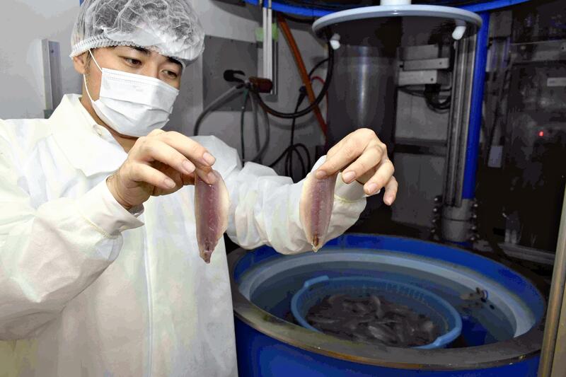 A fillet of horse mackerel for sashimi was being soaked in a saltwater tank at a Japan Seafoods Co. factory, a seafood processing company in Fukuoka City. The tank is used to kill anisakis, a parasitic nematode or worm that lives on fish, by electrocuting them.